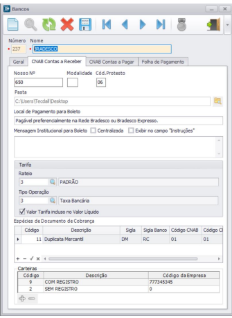 Carteiras: Cadastre as carteiras conforme os números fornecidos pelo banco. Para cada carteira, utilize o botão “+” no grid.