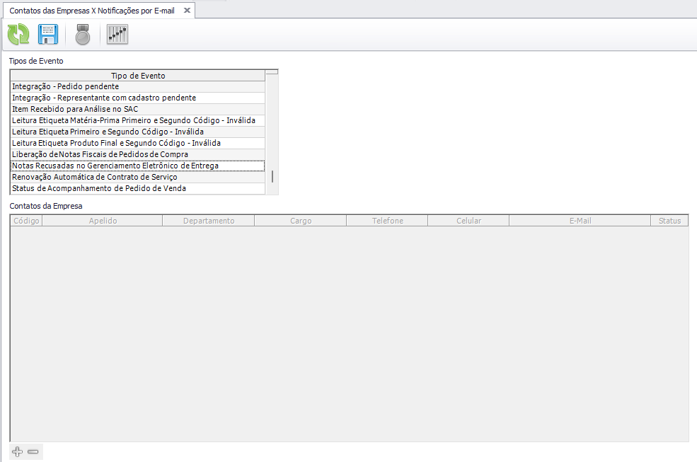 Acesse o caminho Infraestrutura / Cadastros / Contatos das Empresas x Notificações por E-mail (IE0105):
