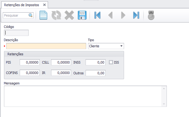Acesse o menu Fiscal > Cadastros > Retenções de Impostos (FC0405):