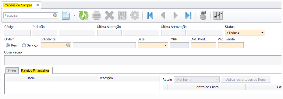 Este artigo explica como configurar rateios financeiros em uma Ordem de Compra.