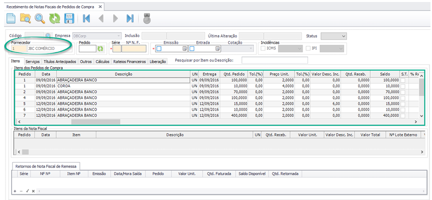 No campo ‘Fornecedor’, selecione o fornecedor da nota fiscal. Serão listados no grid os pedidos de compra pendentes para este fornecedor:
