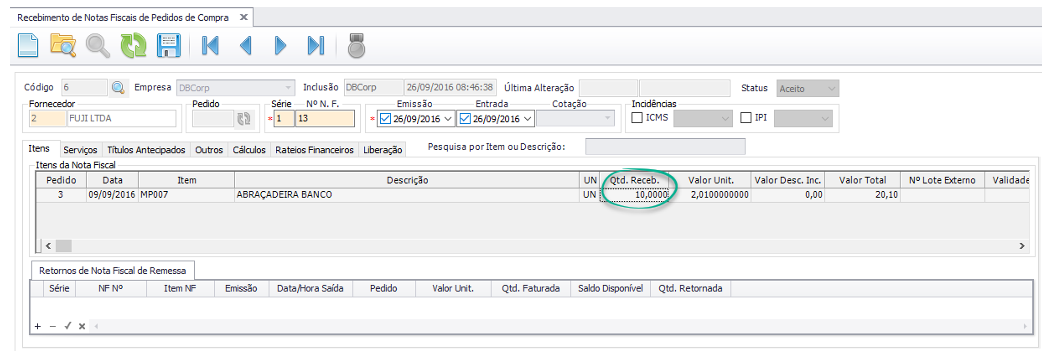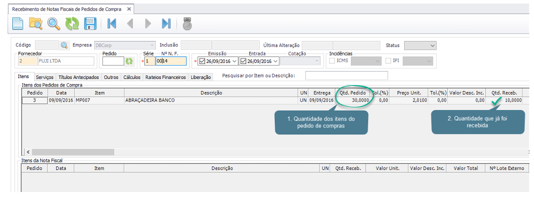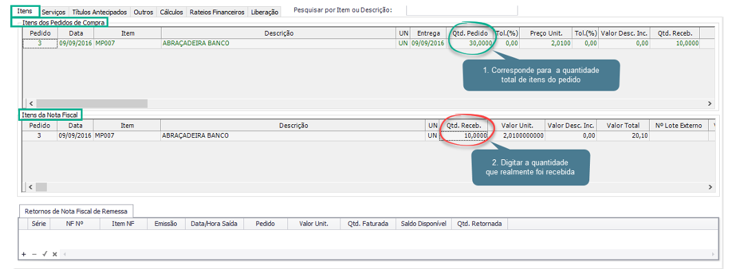 No grid Itens da Nota Fiscal, informe no campo ‘Quantidade’ apenas a quantidade efetivamente recebida, conforme a nota fiscal;