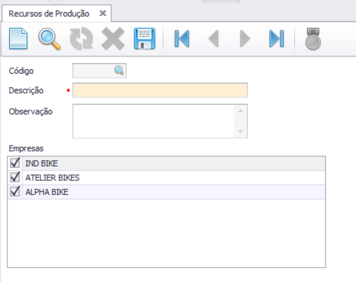 No campo Descrição, informe o nome do recurso de produção que será utilizado no processo produtivo;