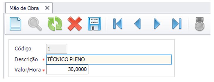No campo Código, o sistema preencherá automaticamente o identificador numérico da mão de obra;